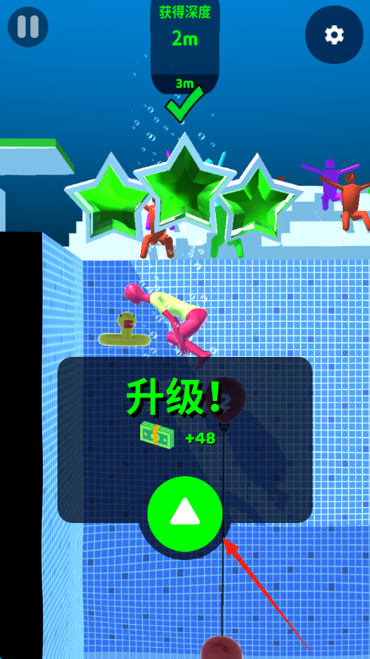 2、目标奖励完成深度目标(2m)可升级,获得金币(+48)、三星评价,解锁新跳水场景(如带人物围观的跳台)。