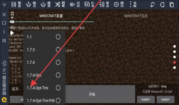 2、打开“MINECRAFT配置”,根据需求选版本(如1.7.10、1.7.4等),点击【开始】,启动对应版本游戏。