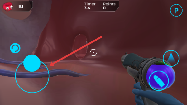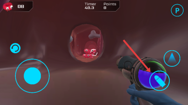 2、游戏中,通过左侧虚拟摇杆(箭头指向),控制武器移动方向,瞄准病毒,保护红细胞。