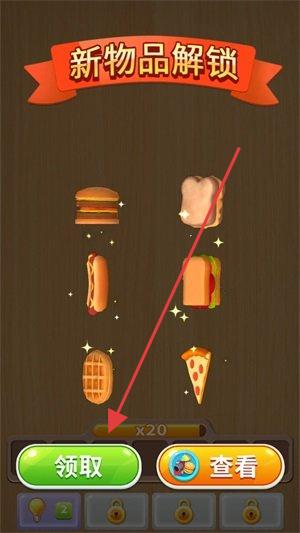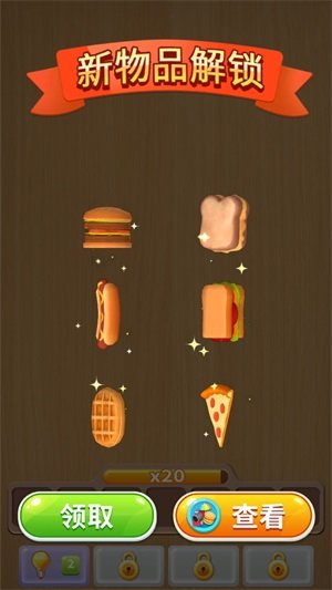 1、在“新物品解锁”界面,点击“领取”获取食物道具(汉堡、披萨等),用“查看”了解详情。