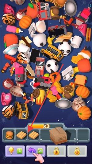 2、进入物品堆积场景,根据下方提示(饼干图标),找出对应物品,完成收集任务(如x3)。