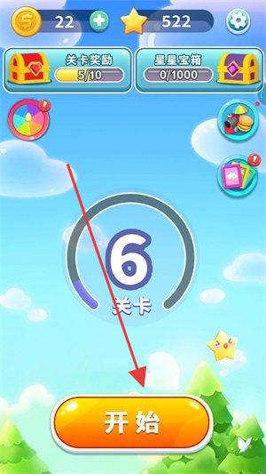 3、在关卡选择页,点击“开始”进入第6关,用收集道具解谜,推进关卡,获取奖励(星星、金币)。