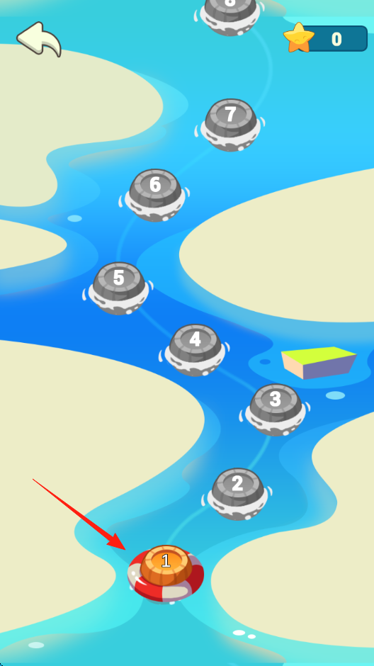1、关卡选择通过河流上的数字石墩(1-8)选关,初始从“1”关开始,收集星星(0)解锁新内容。