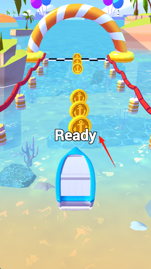 3、目标反馈开局显示“Ready”,比赛中需精准操作,完成赛道获得积分、金币,提升船只性能,挑战高难度关卡(石墩2-8)。