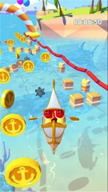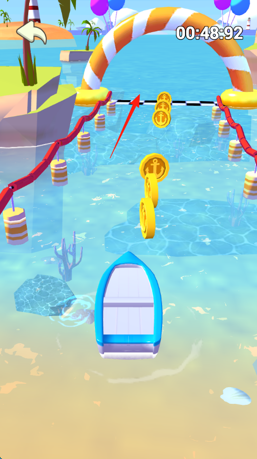 2、玩法机制操控蓝色小船,在水上赛道,避开红绳障碍,收集金币(锚形),冲过终点线(黑白格),限时竞速(00:48:92)。