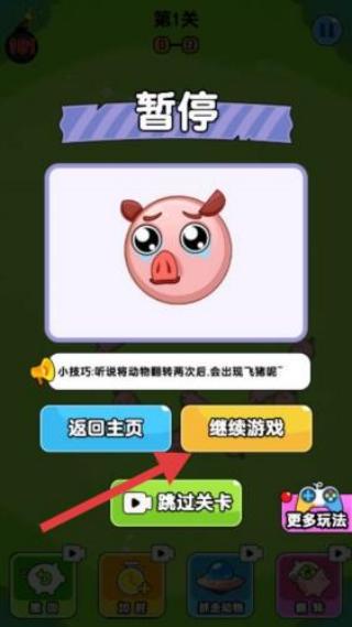 3、继续游戏:暂停时选“继续游戏”,推进关卡,完成小猪捕捉/挑战。