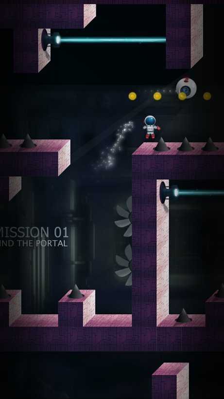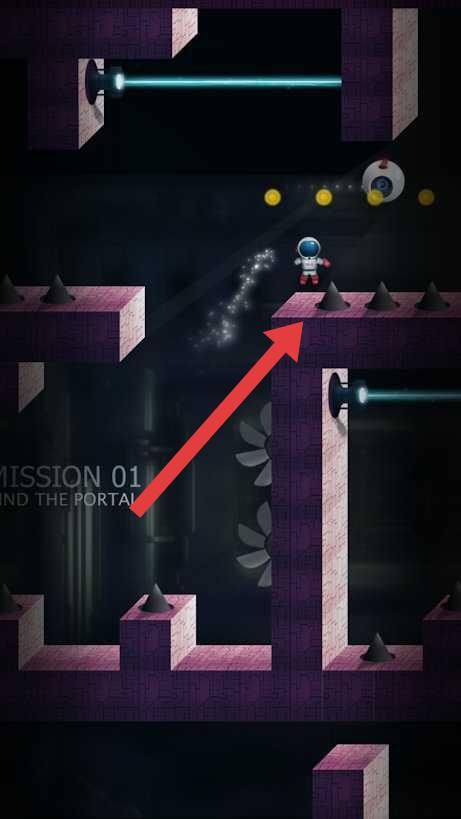 1、在Mission01,操控宇航员跳跃过尖刺障碍,沿箭头方向前进,注意激光陷阱,寻找传送门。