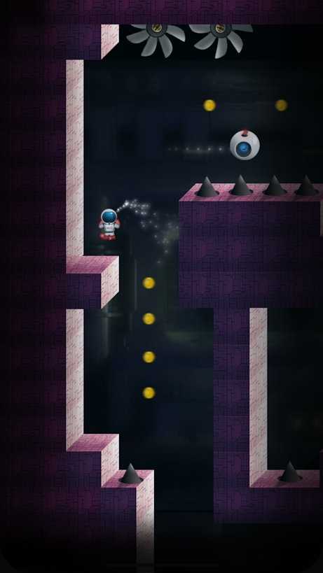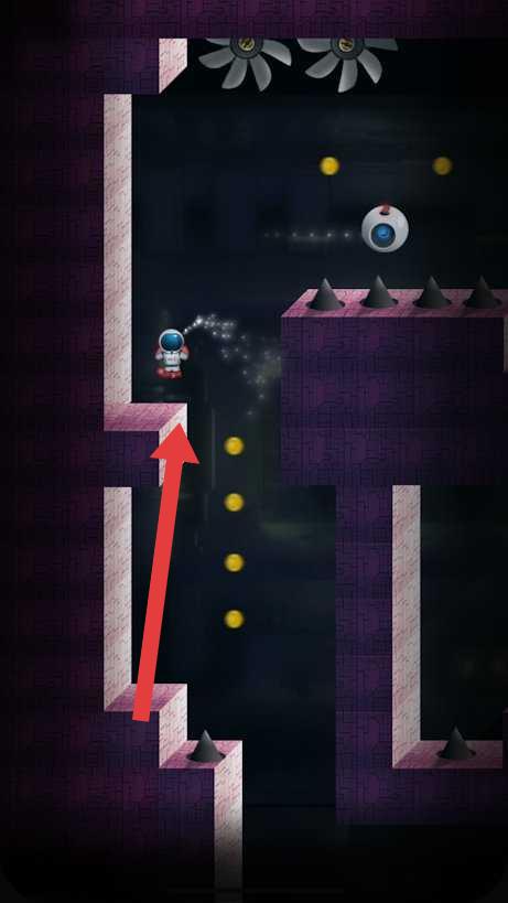 3、面对多层阶梯与移动敌人(眼球状),按箭头指引,精准跳跃,收集黄色光点,推进关卡。