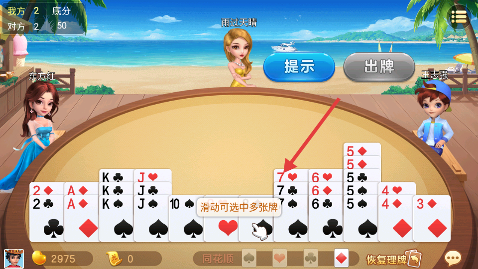 2、智能提示:系统自带战术外挂,同花顺自动高亮标记,以往那些手滑选错牌的尴尬场面从此绝迹。
