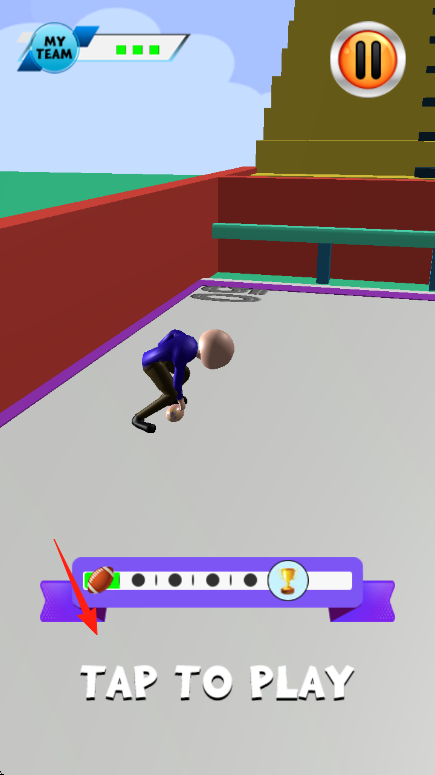 1、模式选择点击“TAPTOPLAY”,控制蓝衣火柴人,在橄榄球场地,开始比赛,界面显示“MYTEAM”状态、暂停键。