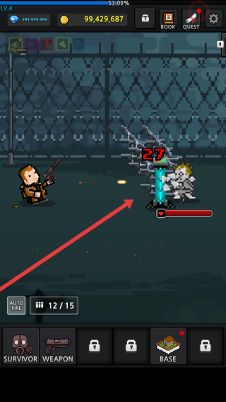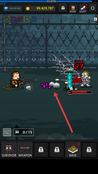 1、操控角色,使用武器射击箭头指向的僵尸(如“STONE-ZOMBIE”),注意躲避攻击,积累战斗经验。