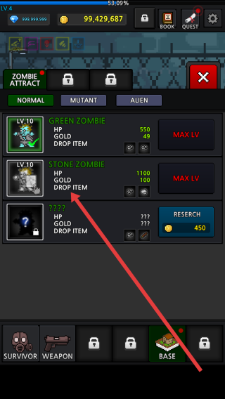 2、进入僵尸图鉴,查看“STONE-ZOMBIE”属性,可花费金币(450)研究,提升对其伤害或掉落收益。