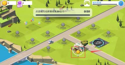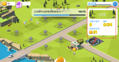 1、通过点击或滑动操作收集场景中散落的金币资源,用于城市建设与发展。