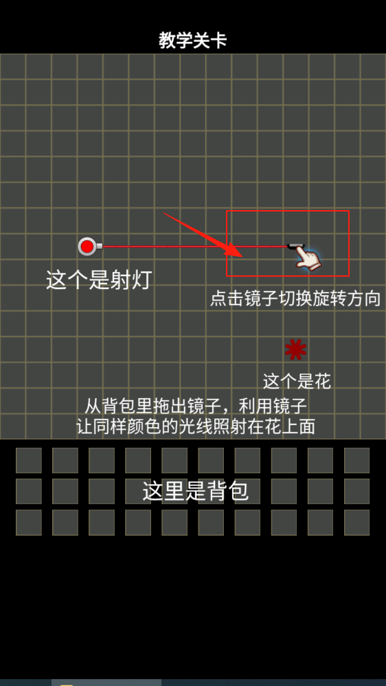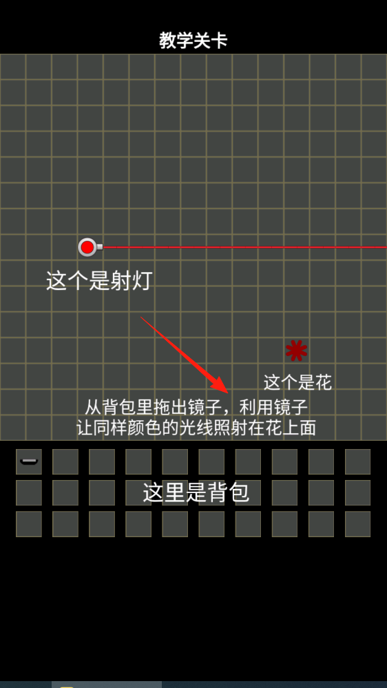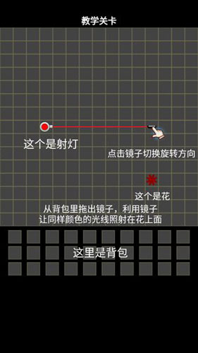 1、镜子挪动操作:通过挪动下方工具栏的镜子,调整反射角度,使光束折射到目标位置(如花的位置),初期关卡简单直观,后续需精准计算反射路径与角度,避免光束偏离。