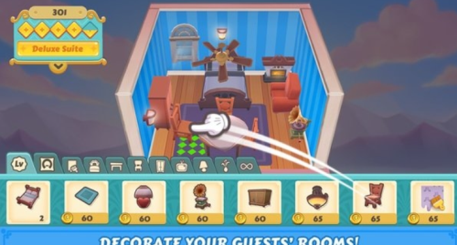 3、使用游戏货币购置风格各异的室内陈设,个性化装潢客房空间,让我们开始打造独一无二的客房空间吧。