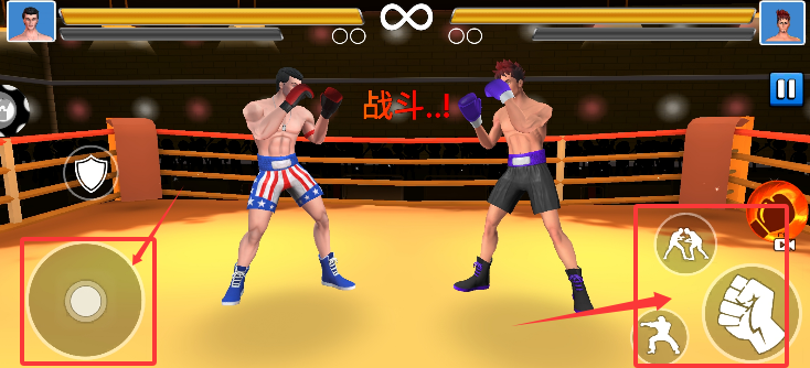 2、进入游戏后,左下角摇杆移动角色,右下角控制角色防御和进攻。
