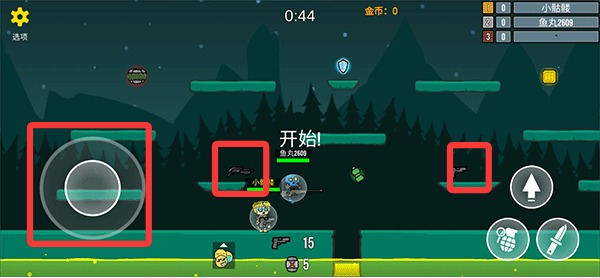 2、游戏开始后,轮盘控制移动,点击屏幕射击。同时还能通过拾取上方的各种装备来击败对手。
