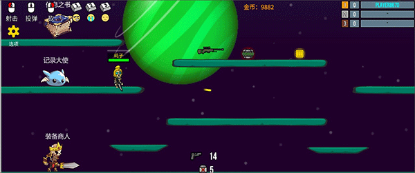 1、玩家将在关卡中操控角色完成不断穿越与射击任务,拾取武器与技能道具,用于击败地图中的敌人。