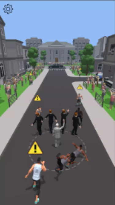 1、点击“TAPTOPLAY”开始Level1,操控角色在道路跑酷,利用保镖(黑衣、墨镜男)抵御红色敌人。