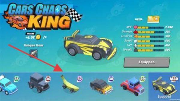 2、赛后去车库,选新解锁车辆(如香蕉造型车),看“Equipped”属性,改装提升战力。