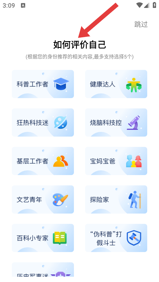 1、首次打开科普中国APP,进入如何评价自己的身份选择界面,界面提供等多种身份标签,根据自身属性挑选后,平台将依据所选身份推送定制化科普内容。