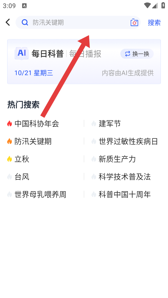 3、若需精准查找科普内容,点击首页上方搜索图标进入搜索页,在顶部搜索框输入关键词,快速定位感兴趣的科学知识。