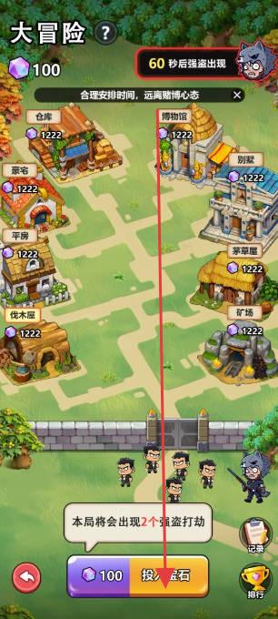 2、冒险探索:进入大冒险副本,投入宝石参与,合理规划时间躲避强盗,探索仓库、博物馆等建筑。
