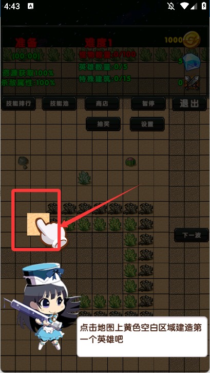 3、开始挑战后点击地图上黄色空白区域建造第一个英雄吧。