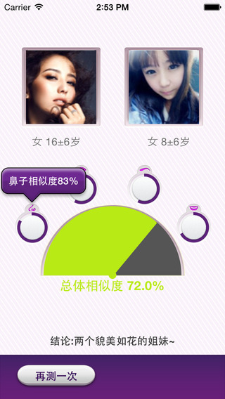 2.使用最先进的人脸识别技术,精确计算出两个人的长相相似度,不信的话您可以拿几张同一个人的照片,测试一下相似度是不是在90%以上。