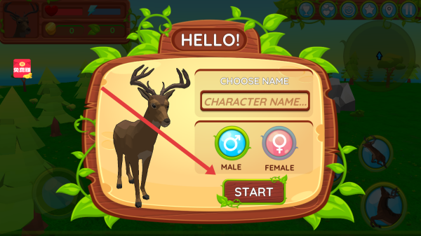 1、点击【PLAY】按钮,进入游戏,创建鹿角色,选择性别(MALE/FEMALE),点击【START】开启森林冒险。