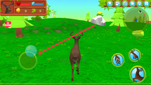 2、在森林场景,使用左侧移动摇杆(箭头指向),操控鹿移动,探索环境,完成生存任务(如觅食、躲避危险)。