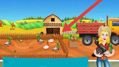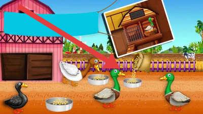 3、在喂养场景,依照箭头方向,将食物投放给鸭子等家禽,完成喂养任务,促进动物成长。