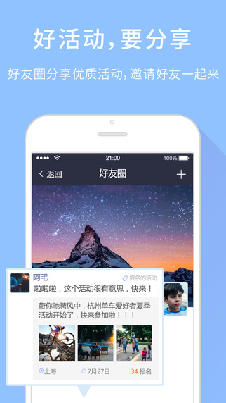 查看好友发起和参与的活动,共享精彩人生。活动均可分享至微信、qq、微博等各大平台,呼朋唤友简单有爱。
