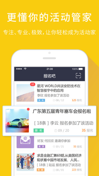 “报名吧” APP是一款基于活动的O2O社交工具,是最好的活动发布和管理工具,是场景时代最佳移动端入口之一。