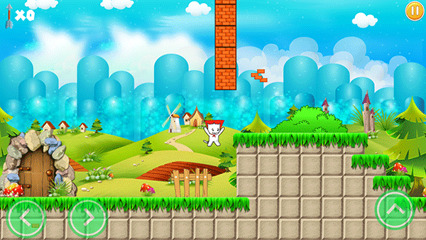 1、进入超级猫里奥IIHD,通过经典虚拟按键控制猫里奥左右移动、向上跳动,开启在满是陷阱关卡中的初次冒险。