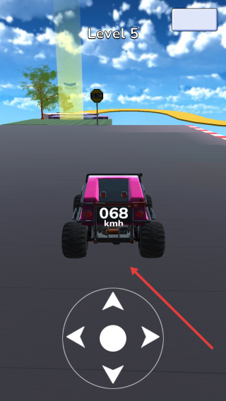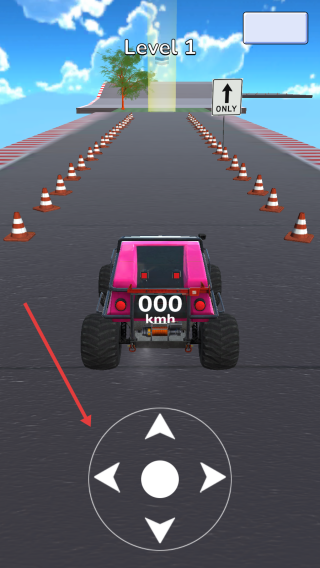 1、Level1中,通过虚拟方向键操控粉色越野车,沿锥桶间道路起步。