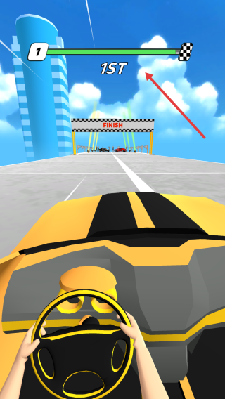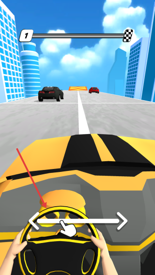 1、起跑阶段,通过方向盘左右转向,调整黄色赛车位置,抢占黑、红车前优势位。