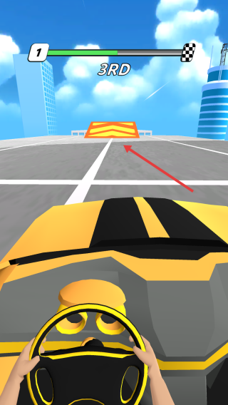 2、行驶中对准黄色坡道加速,借腾空惯性维持速度,提升名次突破3RD。
