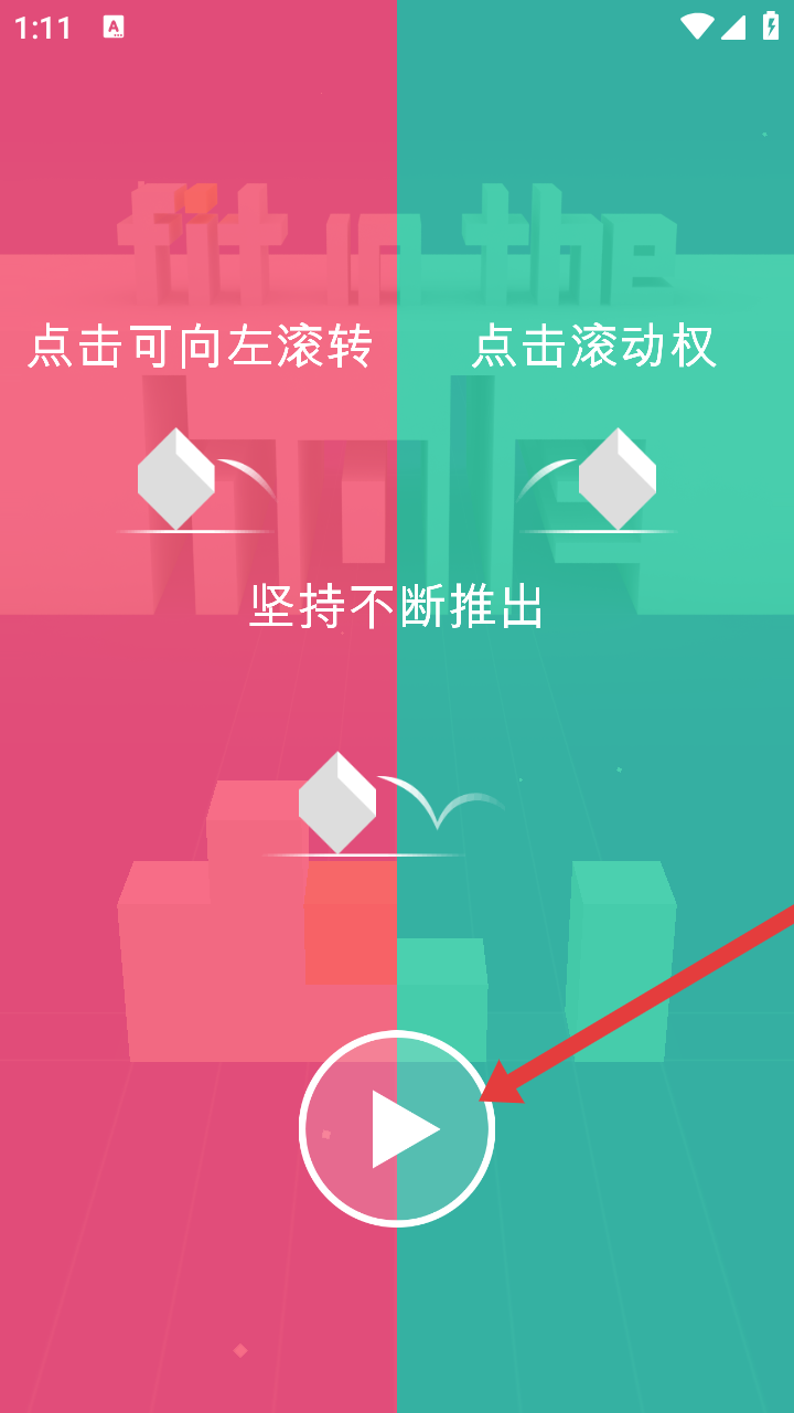 2、在操作指引页,点击底部播放按钮,学习“点击左侧向左滚转、点击右侧向右滚动”的操作规则,掌握方块形变技巧。