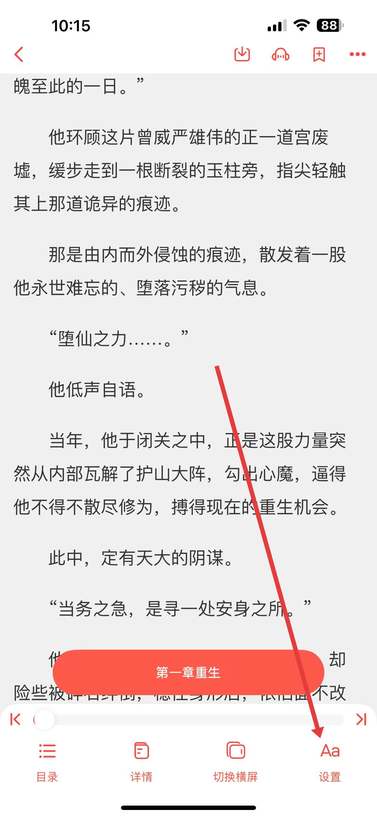 2、在阅读界面点击屏幕中间位置,唤出底部功能栏,点击设置选项。