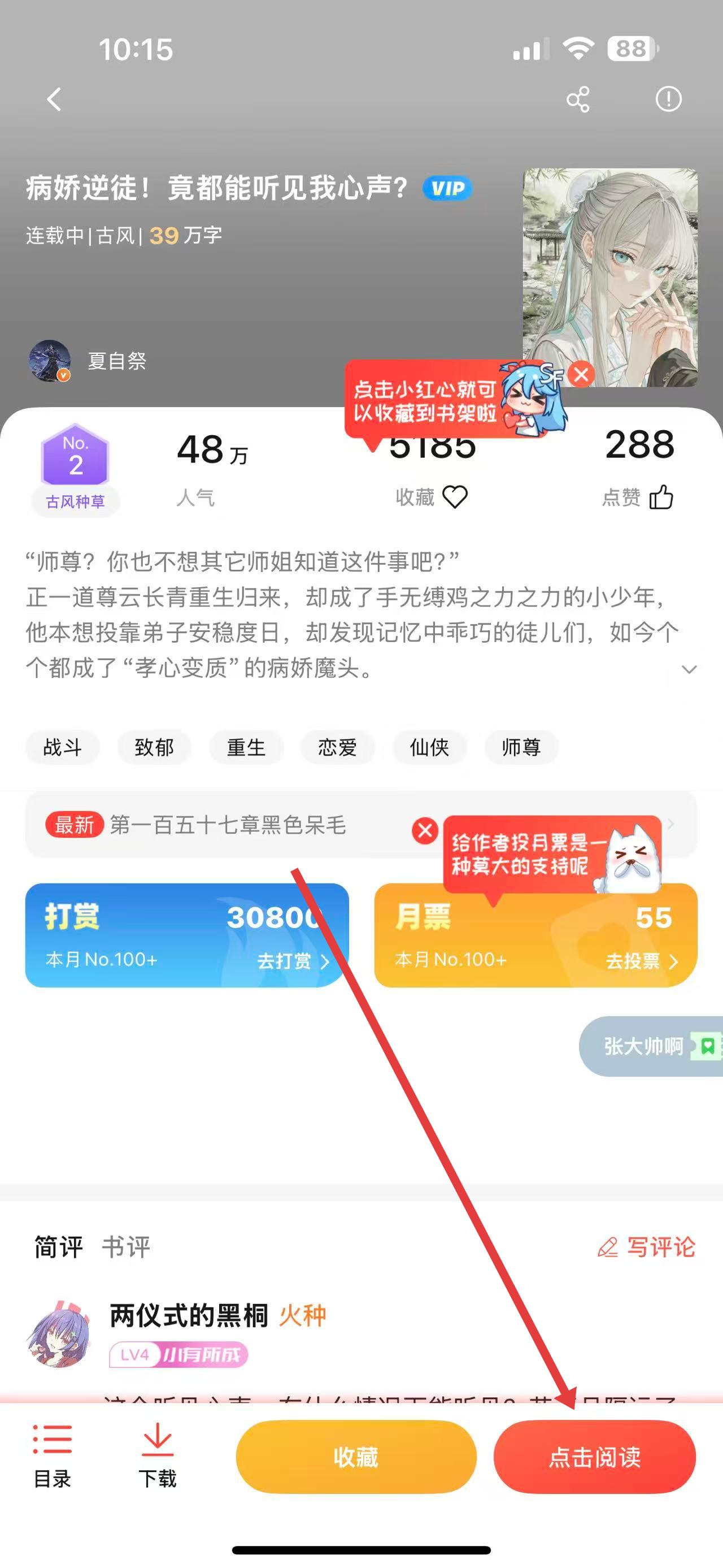 1、在菠萝包轻小说APP里,找到想阅读的小说,点击点击阅读进入阅读界面。