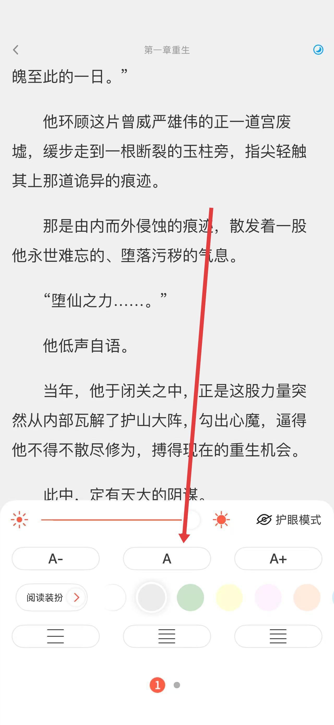3、在设置界面中,找到字体大小调节选项A-、A、A+,选择合适的字体大小还能在下方选择不同颜色的阅读背景,调整阅读装扮。