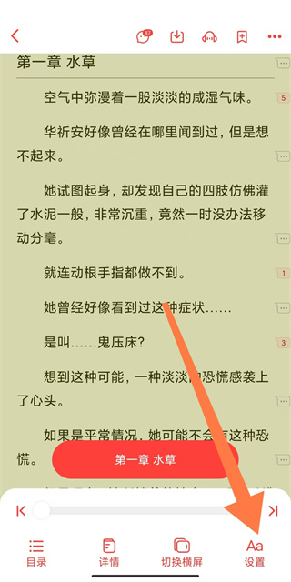 3、在小说阅读界面,点击右下角设置选项,弹出设置菜单。