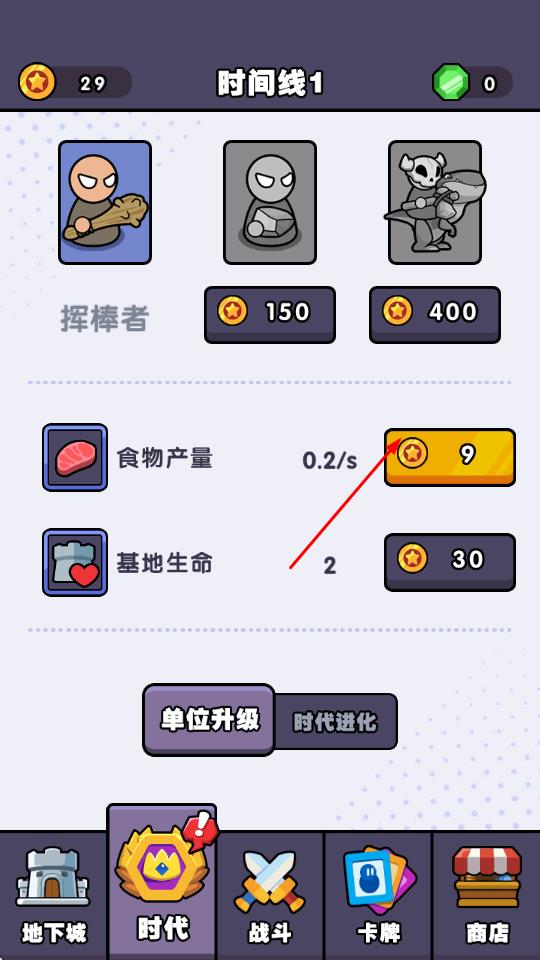 2、战斗中收集金币,用于“时代”界面升级,提升资源产出与防御能力。