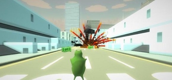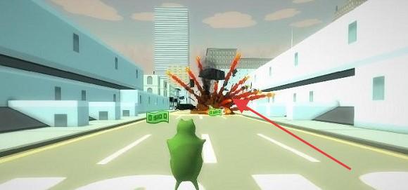 1、操控“绿色青蛙”,用枪射击红箭头“红色敌人”,在城市街道(建筑、车辆)场景,精准命中,推进关卡。