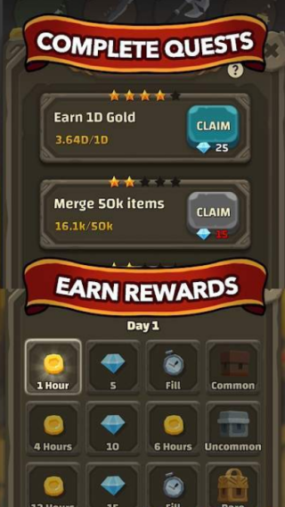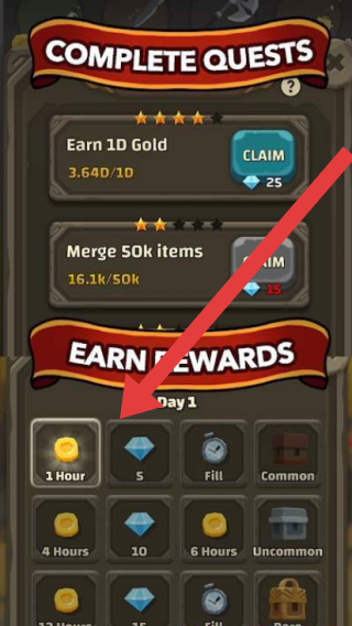2、进入任务界面,点击箭头指向的“1-Hour”奖励栏,领取对应奖励,助力完成“COMPLETE-QUESTS”任务。