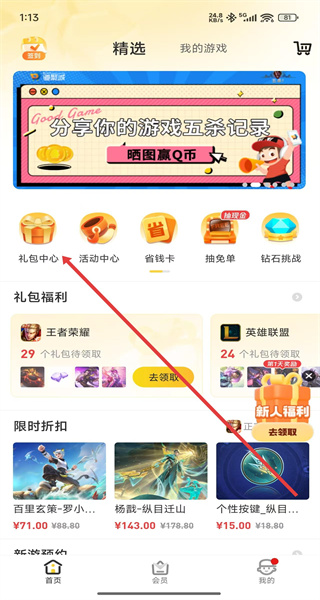 4、在登录成功后进入首页中,可以点击礼包中心,查看更多游戏礼包信息。