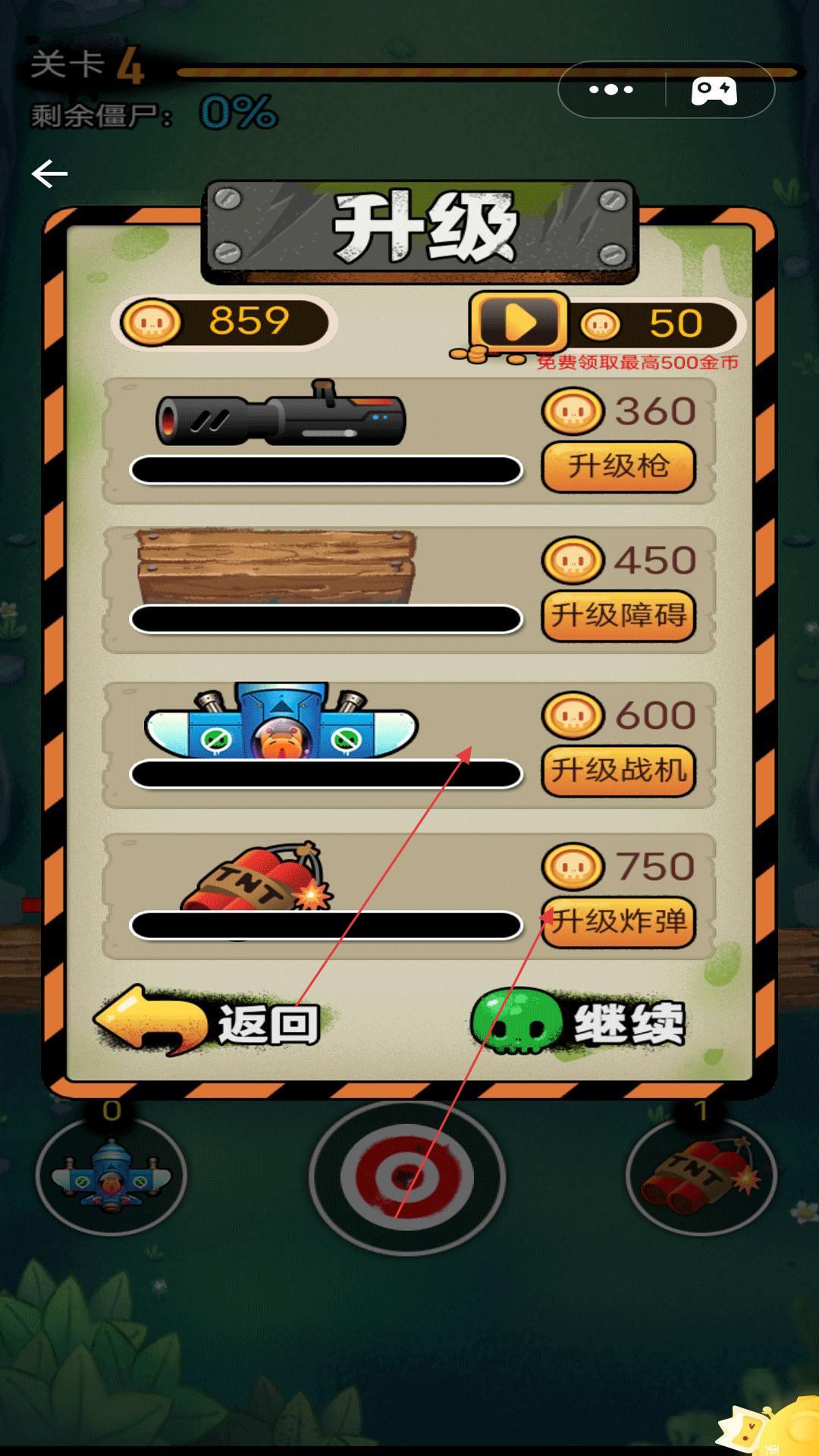 1、在“升级”界面,消耗金币升级枪、障碍、战机、炸弹,增强防御与攻击能力。