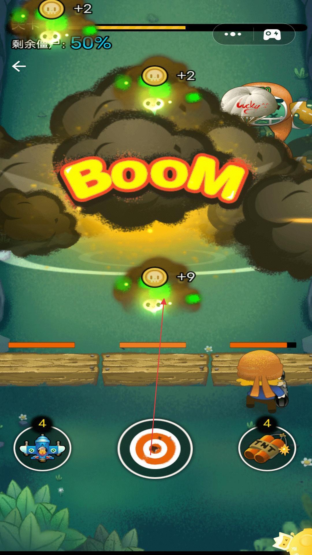 2、战斗中点击目标,发射子弹/使用技能(战机、TNT),消灭僵尸,收集金币,推进关卡。