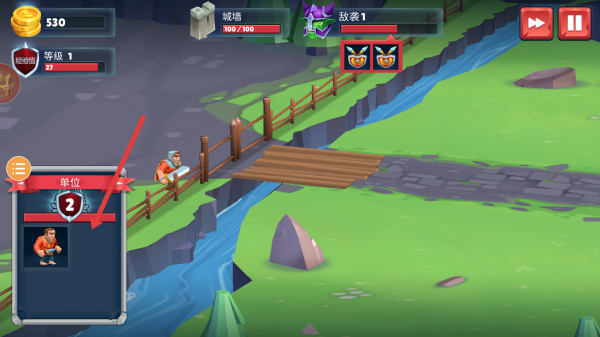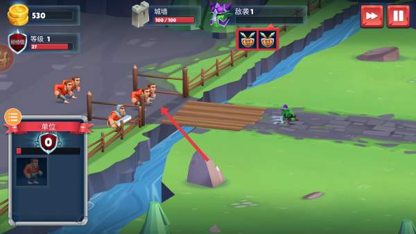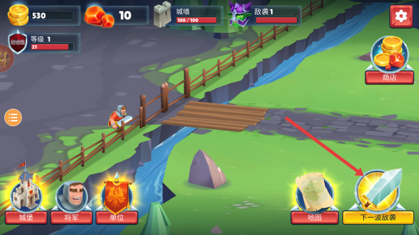 3、防御推进:士兵自动拦截过桥敌人,击杀获取金币资源,用于升级兵种或解锁新单位,持续守护城堡耐久。
